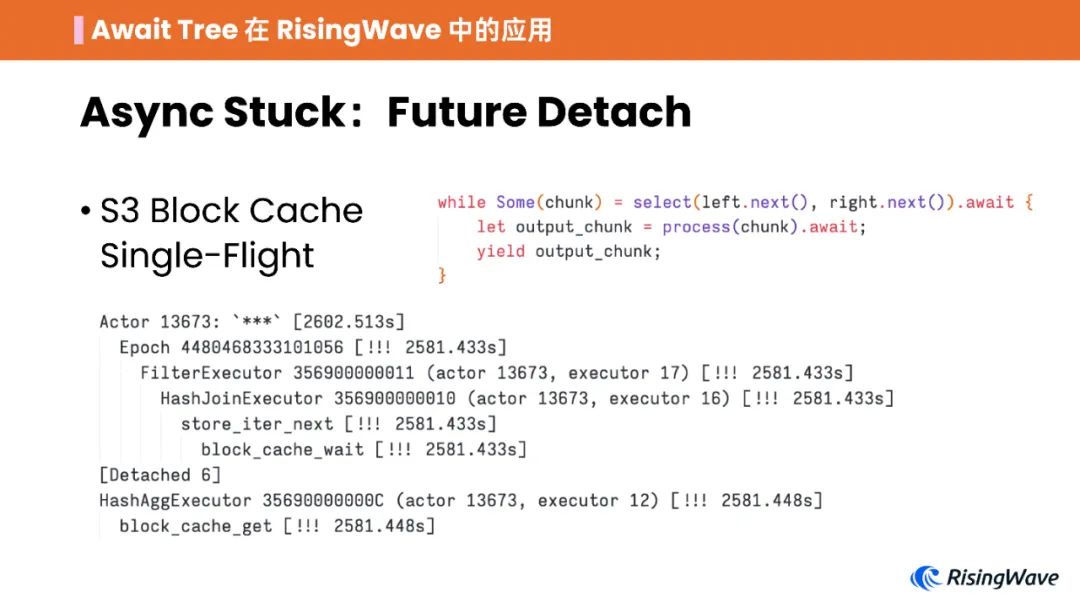 在 RisingWave 引入该优化后,我们常常在测试中遇到某个 Streaming Job 卡住而无法继续执行的问题。通过打印所有 Actor 的 Await-Tree,我们得到了如下的执行状态,发现其中 Block Cache 的网络请求从整个 Await-Tree 上卸载了(Detached),这说明 Actor 即使被网络请求的完成唤醒,也没能重新调用 get