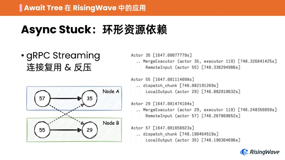 在导出的 Await-Tree 之间,我们发现不同 Actor 上报的阻塞原因之间形成了一个环:下游 Actor 认为上游 Actor 没有产出数据,导致无法继续处理;而上游 Actor 又认为下游 Actor 没能及时消费数据导致了反压,进而无法继续处理——这对于 DAG 执行图而言是不可能出现的情况。通过对比观察,我们将问题锁定在了 Actor 远程通信的 gRPC Streaming 上;在进一步研究 gRPC 库 tonic