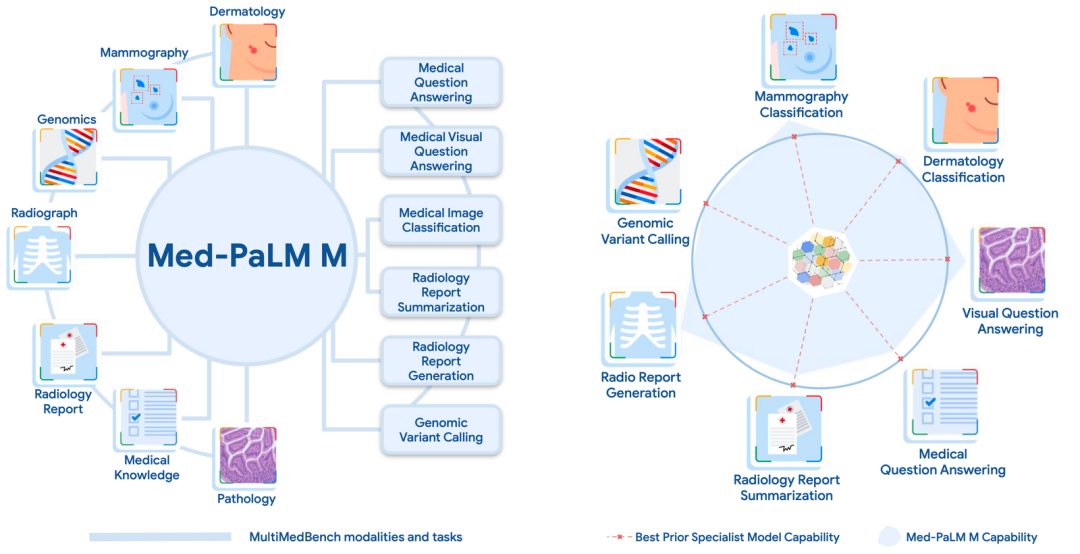 为了应对这一限制,谷歌研究院和谷歌 DeepMind 的合作推出了 MultiMedBench,这是一个由 14 种不同生物医学任务组成的特殊基准。该基准测试是开发和评估通用生物医学人工智能系统的宝贵资源,包含 7 种生物医学数据类型,拥有超过 100 万个样本。MultiMedBench 中包含的任务涵盖了广泛的困难,例如回答医学问题、分析皮肤病学和乳房 X 光检查图像、生成和总结放射学报告以及识别基因组变异。