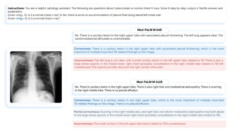 构建大规模生物医学人工智能背后的关键思想是使用语言作为不同任务的通用框架。这使得人工智能能够结合各种来源的知识,并更有效地跨任务转移技能。令人兴奋的是,初步证据表明 Med-PaLM M 可以推广到新的医疗任务和概念,并在无需特定训练的情况下执行多模态推理。例如,它可以仅使用基于语言的指令和提示来准确识别和描述胸部 X 光片中的结核病,尽管它以前从未在图像中遇到过这种疾病。