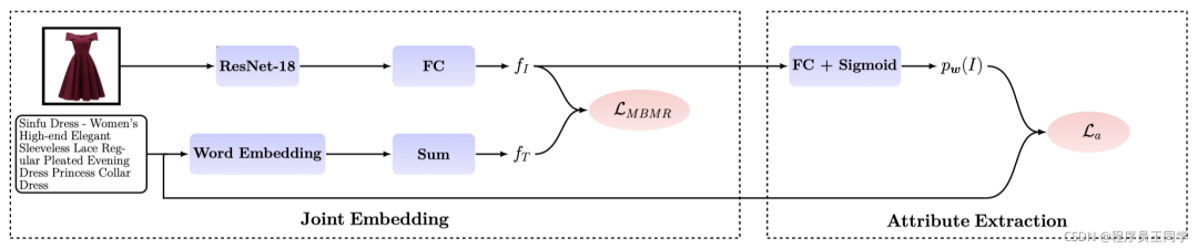 如下图所示,整个模型由两大部分组成,一部分为Joint Embedding,即联合嵌入训练,另一部分为Attribute Extraction,即属性提取。