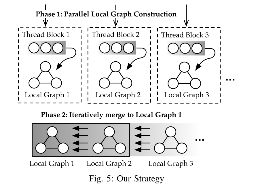 在第 i 次迭代中,会将子图 Gi 中的每个顶点 vij 都分别分配到一个线程块中,因为每个顶点的计算相互独立,所以可以保证线程块间的并行。每个 vij 在根据当前图 G0 检索出 d 个最近邻,用这个点集合和在子图 Gi 中 vij 的邻居集合合并为 vij 的新邻居集合,并且这里面的所有边都会保存在一个边集合 E 中。E 位于 global memory 中用于线程共享。E 的内存开销是 O(n*d)。