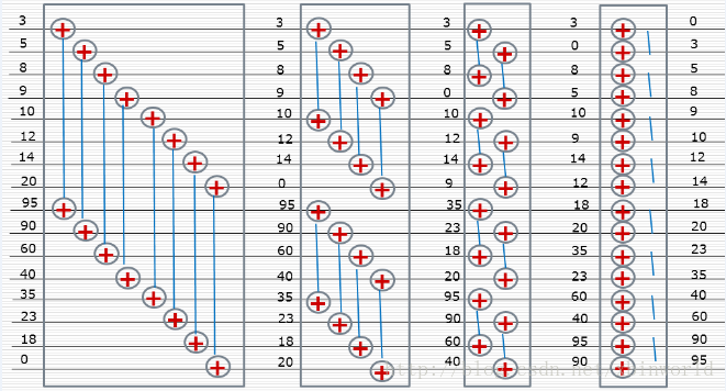 第一次排序:i 取[0,n/2] 将 i 和 2i+1 比较大小。循环一遍后实质上我们得到了4个单调序列;