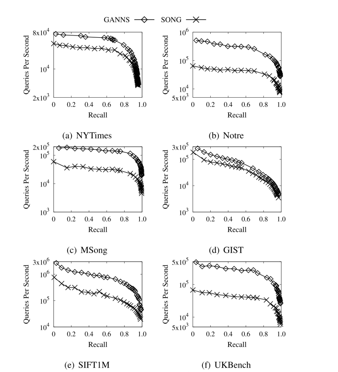 在不同数据集下,与 SONG 的查询效果做比较,保证相同的召回率时,QPS 最高可达到8倍提升。