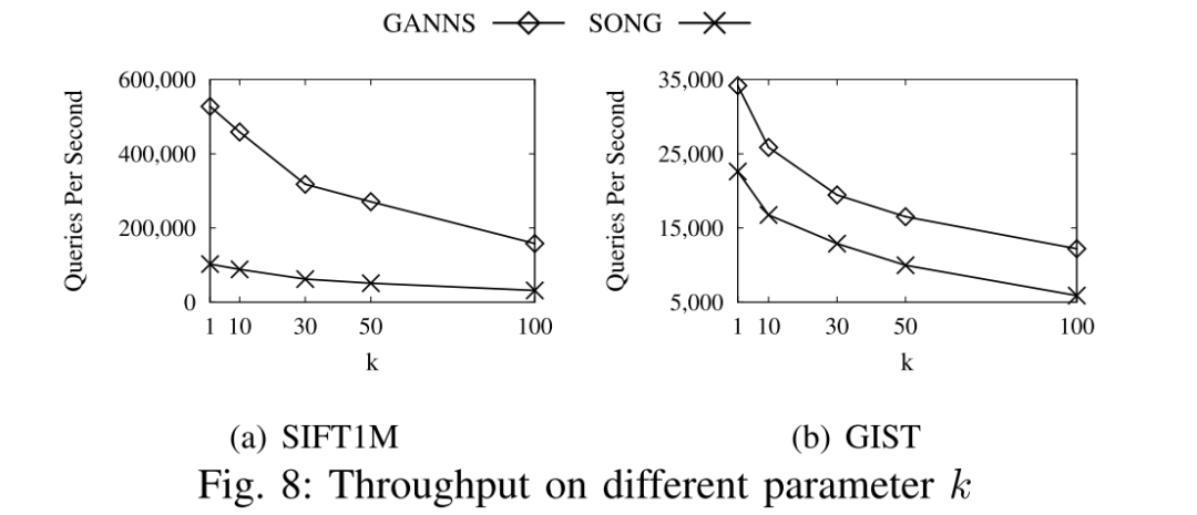 在不同的 K 值选择下,GANNS 也表现出了更高的吞吐量。