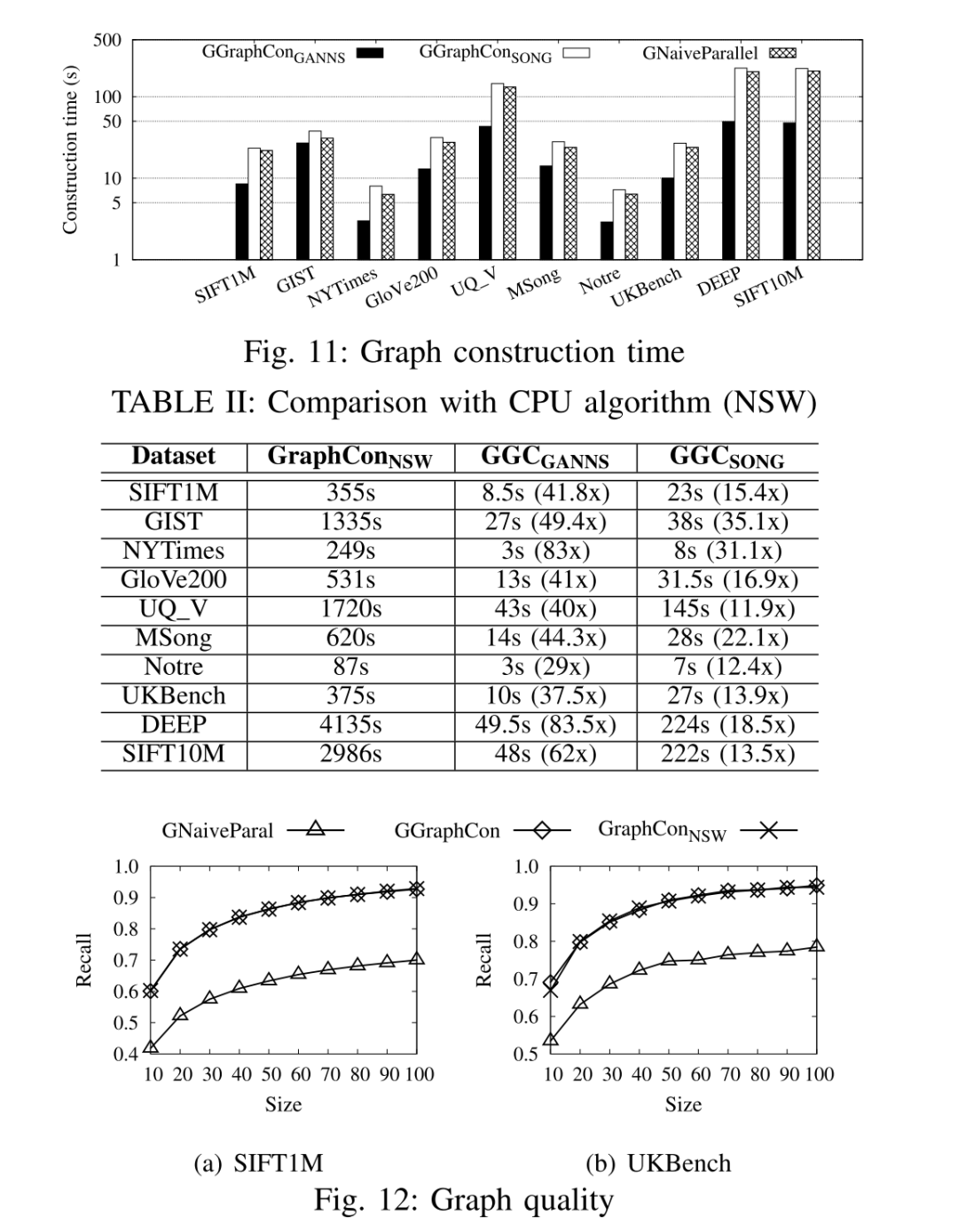 在图的构建方面,构建时间最多能达到 GPU 的83.5倍,相比 SONG 最高也可达35倍。衡量图质量的方法是相同的查询在 NSW 图和 GANNS 图是否能达到相同的查询,实验结果看到与原图质量几乎一致。