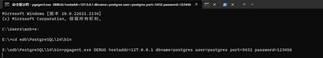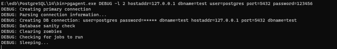 pgagent.exe DEBUG hostaddr=127.0.0.1 dbname=test user=postgres port=5432 password=123456