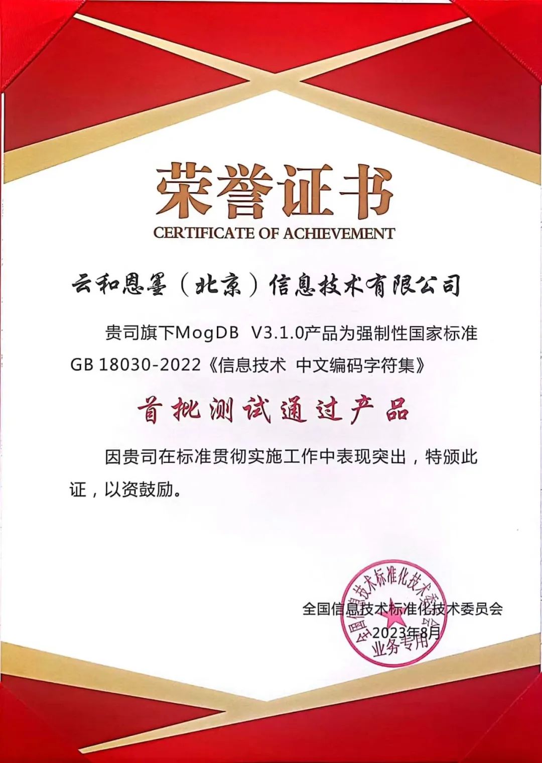 为实现对新国标的支持,云和恩墨积极推动标准贯彻实施,加速相关产品适配。“MogDB 企业版数据库管理系统”顺利通过赛西实验室的标准符合性测试,于2023年8月8日获颁证书,成为首批通过强制性国家标准GB18030-2022《信息技术 中文编码字符集》的产品,并获得最高级(实现级别3)认证。同时,鉴于在标准贯彻实施工作中的突出表现,云和恩墨还获颁荣誉证书,受到表彰。