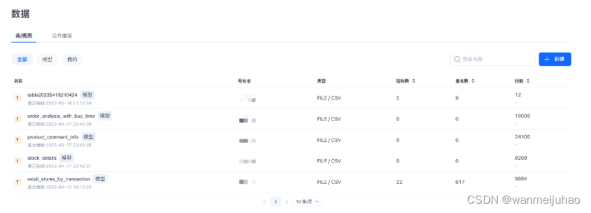 注意事项:①. 只能使用 .csv 格式的文件,如果是 excel 文件,可直接另存为 .csv 文件格式,要求文件编码为 UTF-8。②. 单个 .csv 文件大小需低于 200 MB。③. 尽量避免使用全角的符号,因为 csv 采用字段分隔符为英文逗号(,)、竖线(|)或英文分号(;),如果在表格中使用了全角的逗号可能会造成列的偏移。④. 表头最好是使用英文,因为后面视图 sql 关系会用到,所以最好推荐使用英文(不过试过中文其实也可以)。⑤. 格式时间最好使用 YYYY-MM-DD 或 YYYY-MM-DD hh:mm:ss 的时间格式。