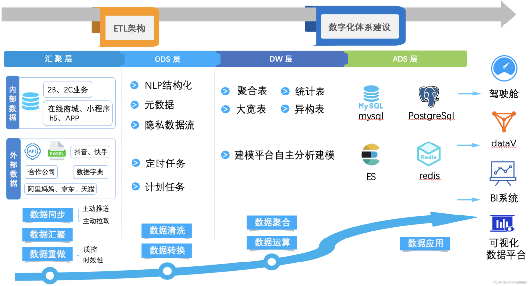 2.通过 DW 数据仓库,将元数据经过数据治理方案,对接到下游的数字化体系应用,如驾驶舱、数据大屏、BI 系统、数据可视化系统中。
