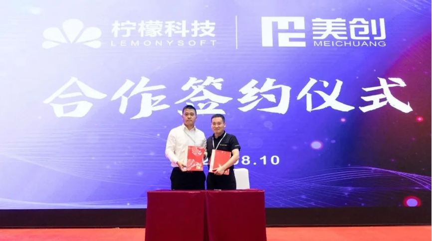 无锡柠檬科技总经理、柠檬文才创始人雷虹与杭州美创科技股份有限公司高级副总裁罗亮亮进行合作签约