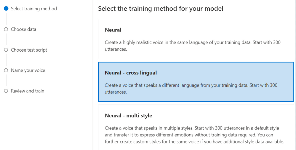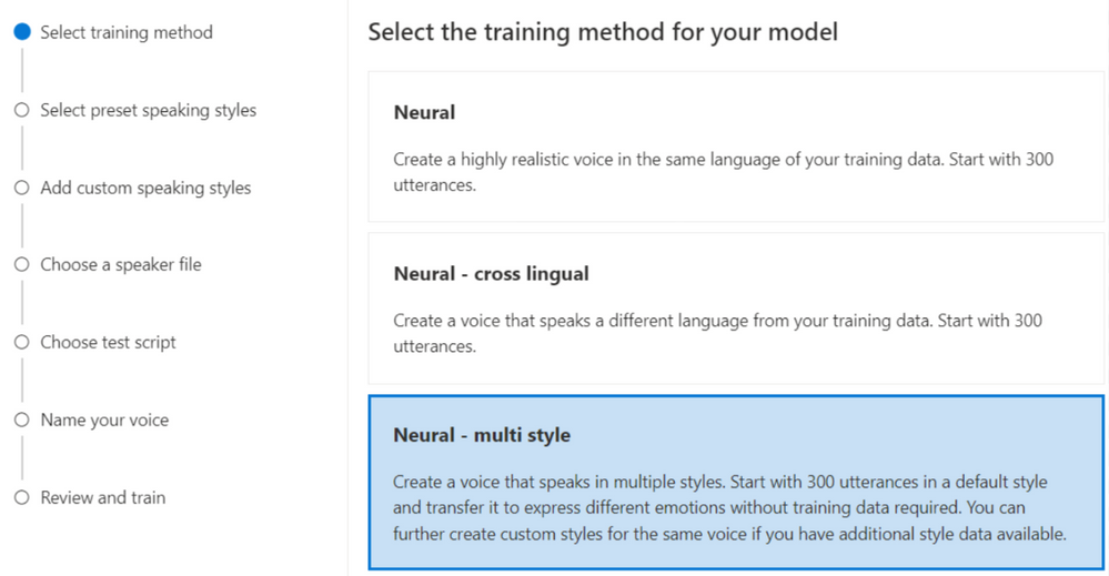 再将准备好的数据导入到 Speech Studio 门户后,在训练方法中选择 Neural - multi style(神经网络 - 多风格)。