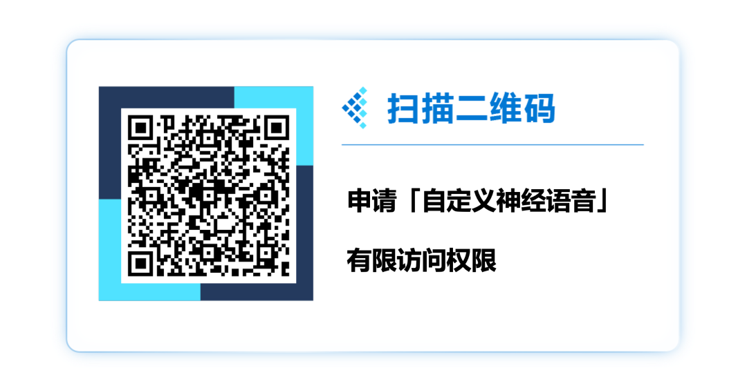 定制神经语音是一项有限访问服务,这是微软对「负责任的 AI」的承诺的一部分。如果你对这项功能感兴趣,请扫描下方二维码申请访问该技术的权限,并遵循「负责任的 AI」部署准则以确保负责任地使用这项功能。