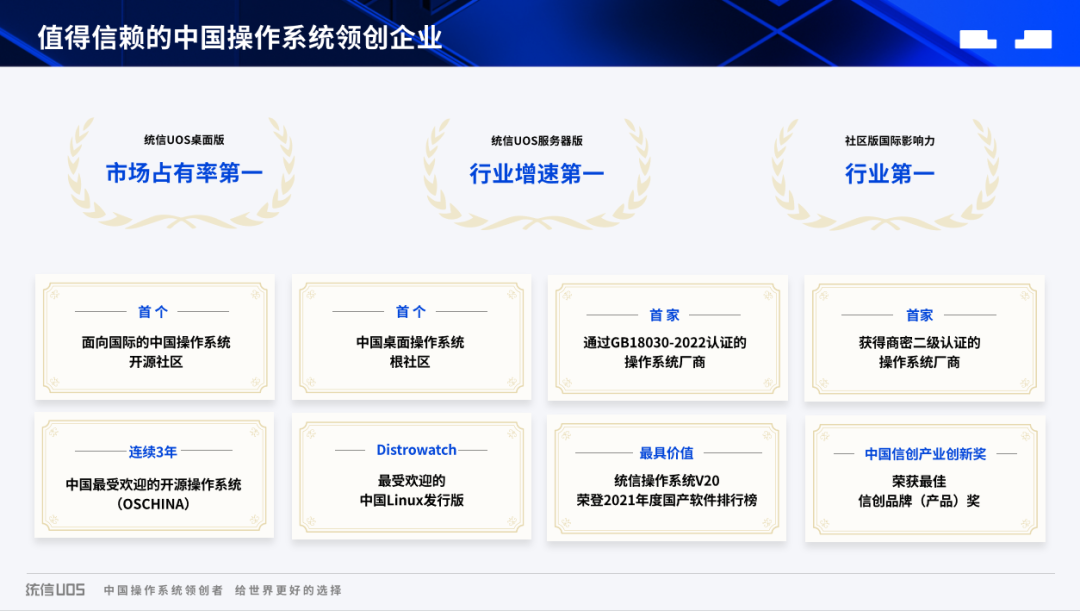 此前,统信软件宣布迎来品牌体系全面焕新——“中国操作系统领创者,给世界更好的选择!”,这代表统信软件希望扮演好赋能者的角色,利用产品、解决方案、行业理解以及人才储备,向全球客户、用户提供卓越的产品和服务,最终实现提升效率、降低成本、改善生活的目标。