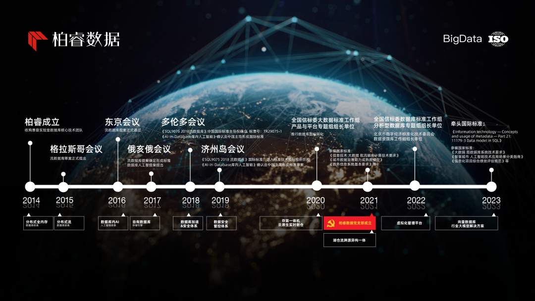 柏睿数据董事长兼首席科学家刘睿民是我国大数据领域的国际标准主笔第一人。在国际上,如今的柏睿数据在多个国际标准组织担任职务,深度参与并积极引领多个数据库国际标准制定。