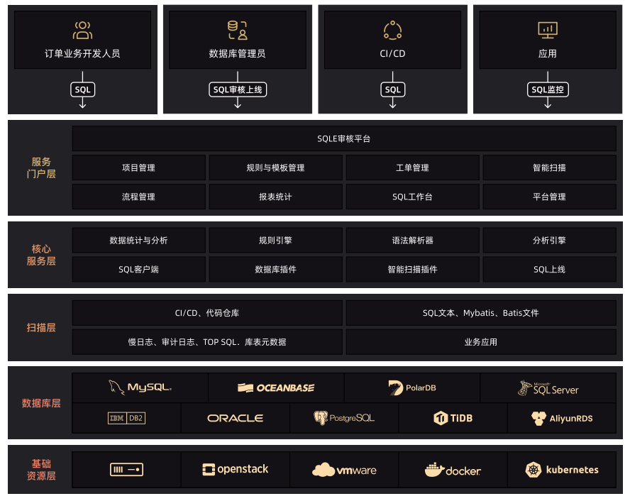 SQLE 覆盖开发、测试、上线、生产环境各阶段对 5QL 进行审核,及早发现问题 SQL业务稳定性提升 60%。