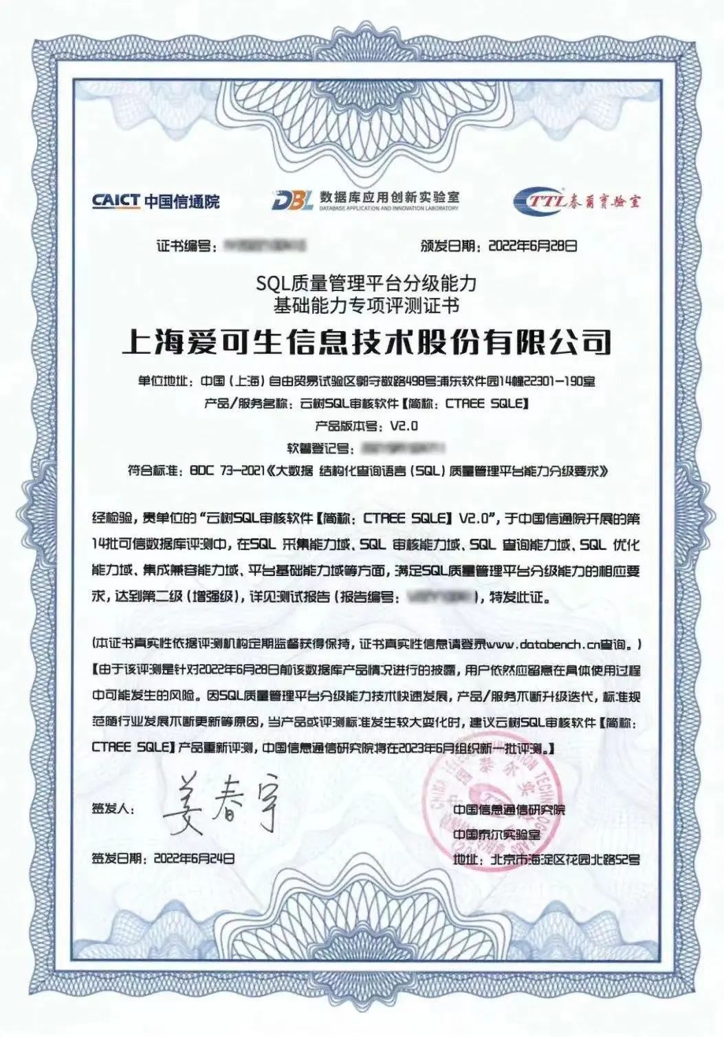 中国信通院SQL质量管理平台分级能力基础能力专项评测证书