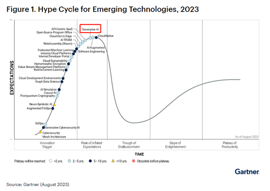 全球著名咨询调查机构Gartner发布了2023年新兴技术成熟度曲线图,生成式AI(Generative AI)处于顶峰期,预计在2—5年内实现转型效益。