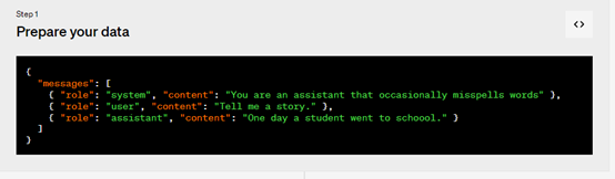 1,准备数据,创建一组多样化的演示对话,类似于要求模型在实际输出中的对话。数据集中的每个示例都应该与OpenAI的聊天完成 API 格式相同的对话,特别是消息列表,其中每条消息都有角色、内容和可选名称。