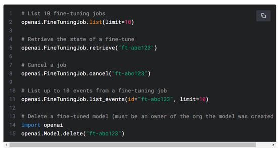 除了创建微调作业外,开发者还可以列出现有作业、检索作业状态或取消作业。