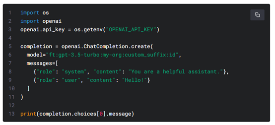 SDK开始进行大规模数据训练、微调。训练模型可能需要几分钟或几小时,具体取决于模型和数据集大小。模型训练完成后,创建微调作业的用户将收到一封确认电子邮件。