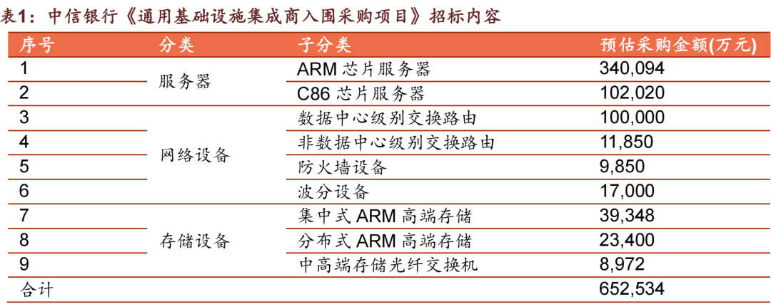 大型银行有望提前完成信创改造,中小型机构长尾效应逐步释放,金融 IT 业绩持续兑现。中信银行本次采集设备包括服务器、网络设备、存储设备共三大类,其中服务器价值量超过 50%。从预估招标金额和数量上来看,可能涉及存量替换。从招标节奏上来看,大型银行有望在 27 年之前基本完成信创改造,随后中小行的长尾效应逐步释放,IT 厂商也可以将与大型机构合作中积累的经验赋能中小机构,实现业绩持续兑现。