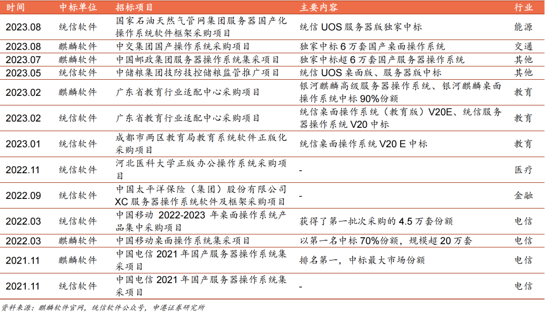 麒麟软件和统信软件近三年中标情况(不完全统计)