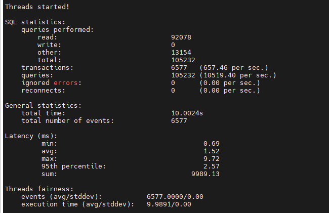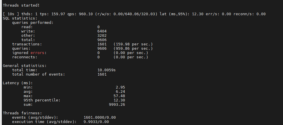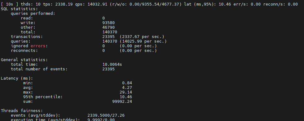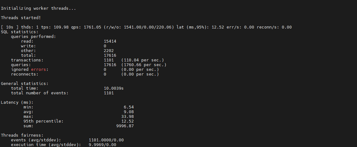 [ 10s ] thds: 1 tps: 16.70 qps: 334.75 (r/w/o: 234.47/66.79/33.50) lat (ms,95%): 87.56 err/s: 0.00 reconn/s: 0.00