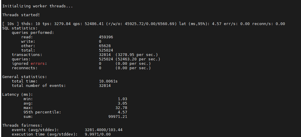 sysbench --config-file=config oltp_read_write --tables=5 --table-size=10000 --db-ps-mode=auto --report-interval=10 --rand-type=uniform run