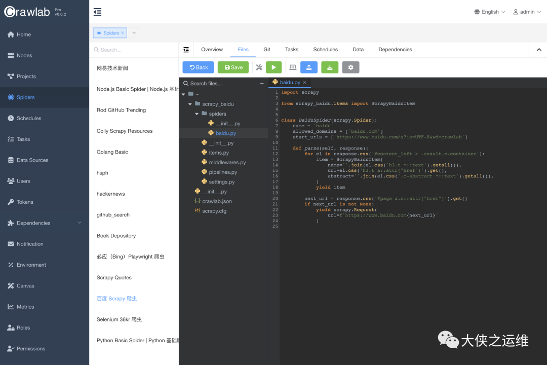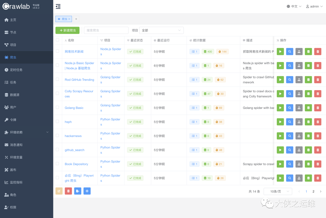 go写的一款企业级的管理爬虫的工具,文档很全,该有的功能都有,个人用于用于管理日常的一些爬虫任务,绰绰有余,企业内部如果有一些爬虫内容,开源版本用于管理也是足够的,对于运维来讲,完全可以用来作为作业平台嘛。