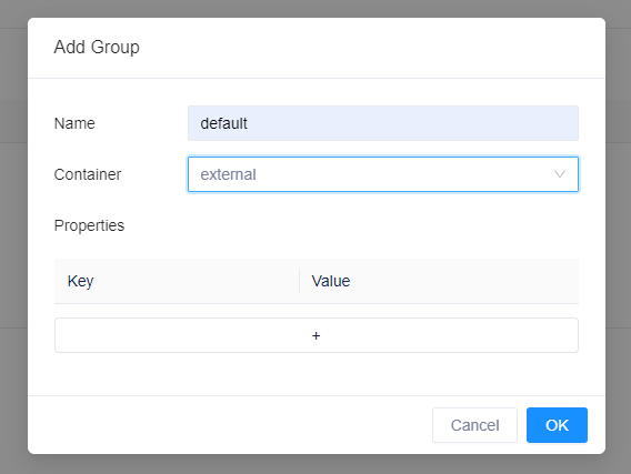 在弹出的对话框中,输入 Group Name 为 default,Container 类型为 external。点击 OK 按钮保存
