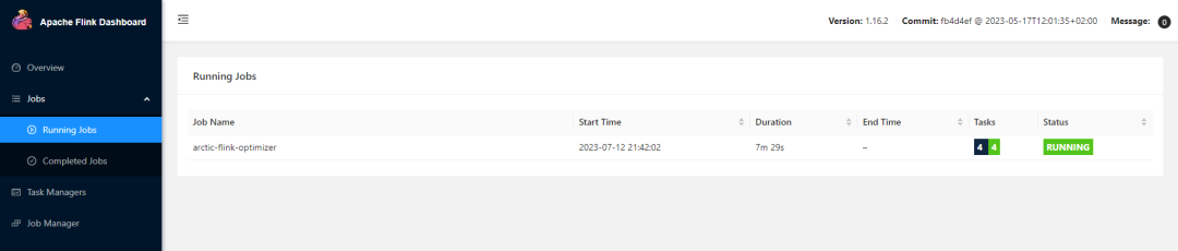 也通过kubectl proxy 访问Pod内端口,通过链接 http://{arctic-ams-host}:8081/api/v1/namespaces/default/services/arctic-default-optimizer-rest:rest/proxy/#/job/running 可以看到刚提交的任务的 Flink Dashbord。
