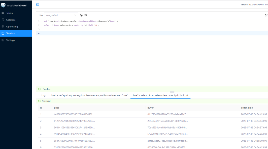 在 Flink 任务持续入湖的过程中,再通过 Spark 查询湖上的数据。AMS 集成了一个 embedded Spark 环境,切换到 AMS 的 Terminal 页面,选择 aws_default Catalog ,执行以下 SQL