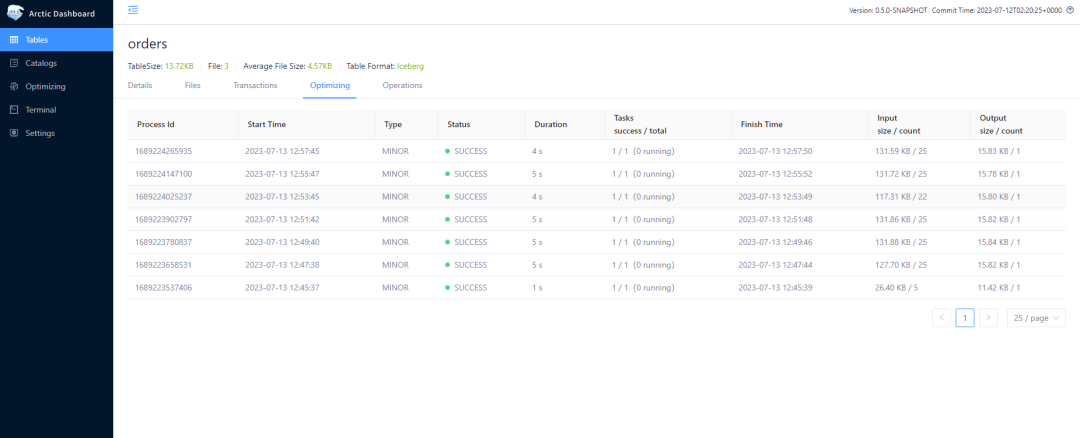 页面上展示了表上执行 Optimizing 的历史,每次 Optimizing 的输入数据量和输出数据量。可以看到基本每 3-5min 就会触发一次 Optimizing, 每次执行大约都会将 25 个小文件合并成一个文件,对比输入输出数据规模,可以看出每次合并都消除了大量的无效 delete 数据。