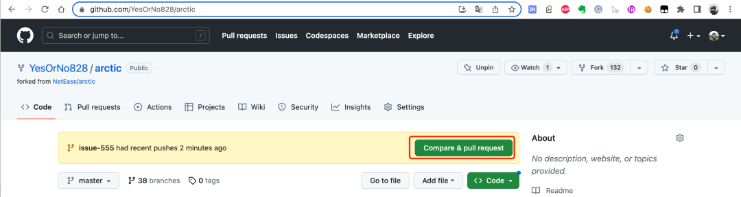 打开 GitHub 地址,然后点击 Compare&pull request 按钮;