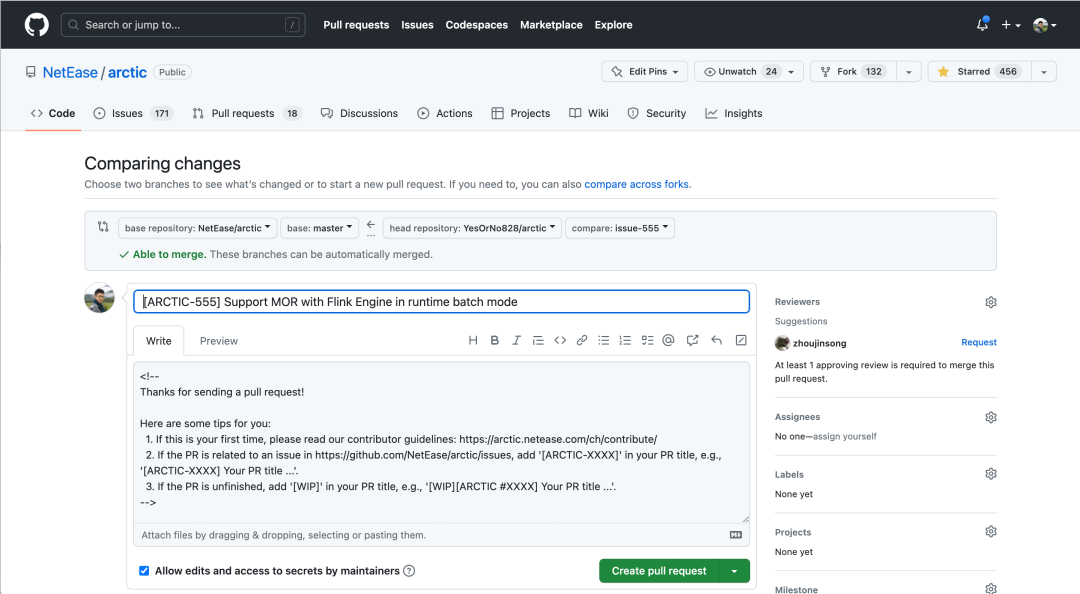 head 是你自己的开发分支,base 是 NetEase/arctic master 分支。