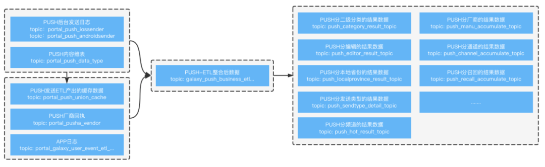由于推送时机的不确定性,push 业务的数据指标一般不是增量型的,而是以当天截止到当前的各种累计型指标为主,计算窗口通常为十五分钟到半小时不等,统计维度区分发送类型、内容分类、发送票数、发送厂商、首启方式、用户活跃度、AB 实验等,具有流量波动大和数据口径繁多等特点。