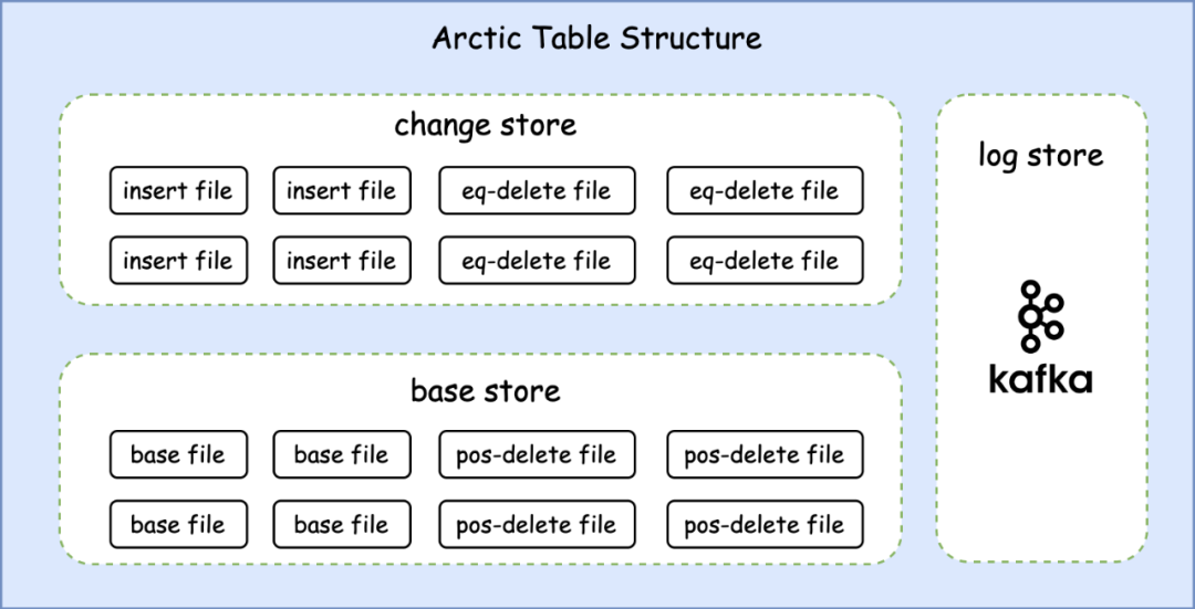 Arctic 能够兼容已有的存储介质(如 HDFS)和表结构(如 Hive、Iceberg),并在之上提供透明的流批一体表服务。存储结构上主要为 Basestore 和 Changestore 两部分: