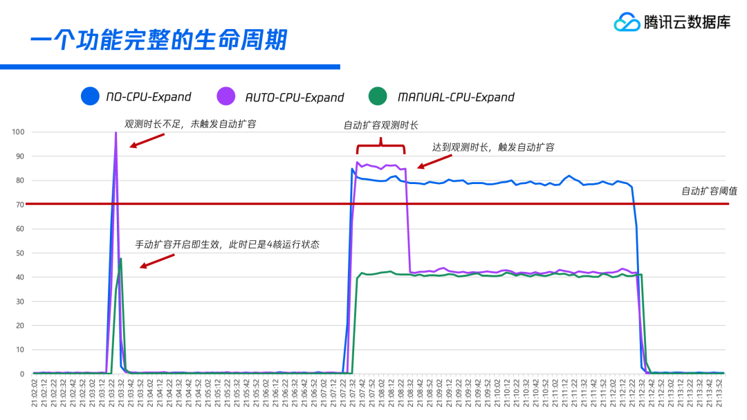 自动扩容:用户自行设置扩容阈值和观测周期,默认扩容1倍核数,当实例 CPU 达到阈值超过观测周期时,扩容功能生效。相同地,当实例 CPU 达到缩容阈值超过观测周期时,缩容功能生效,期间无需客户做其他操作。
