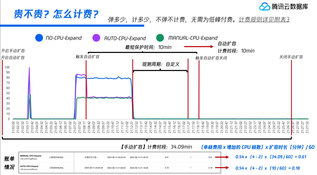 如上文所述,CPU弹性扩容分为自动扩容和手动扩容两种类型,不同类型其收费逻辑是不同的。