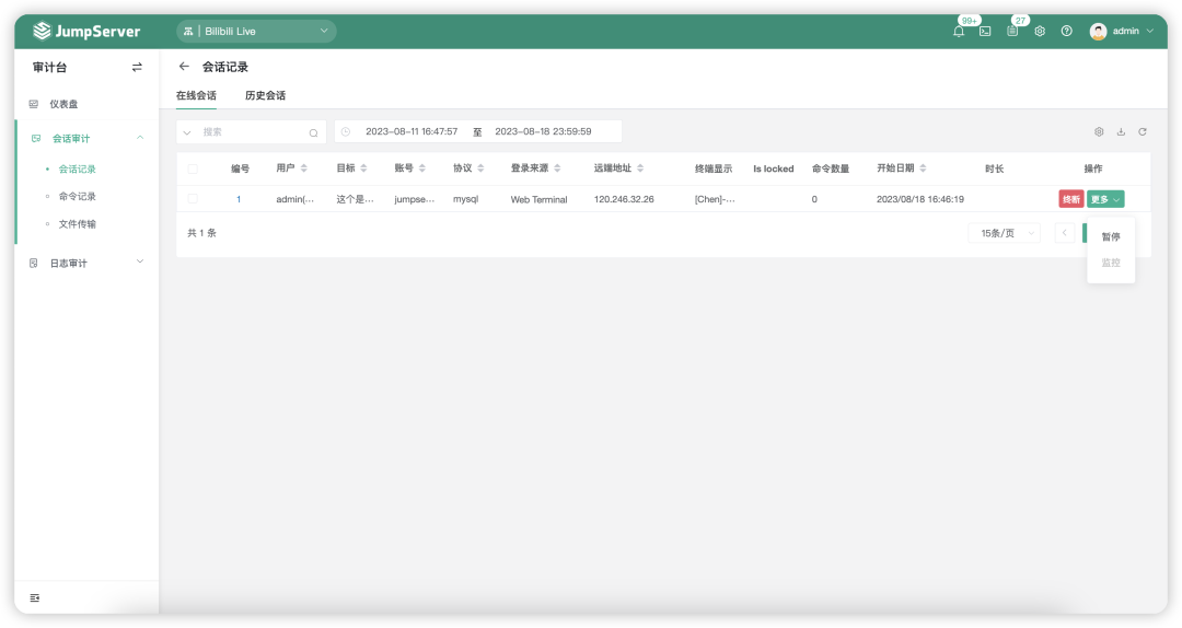 JumpServer v3.6.0版本中,选择“审计台“→ “会话审计”→ “会话记录”,管理员可以对当前在线的会话执行“暂停”和“恢复”操作,被“暂停”的会话将无法操作,直到被管理员选择“恢复”选项进行恢复。