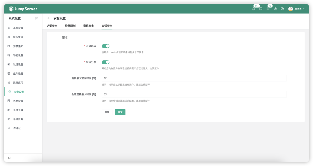 在JumpServer v3.6.0版本中,支持在“系统设置”页面对会话的最大连接时长进行配置,当会话到达最大连接时长配置项的值后,会话会被强制断开。