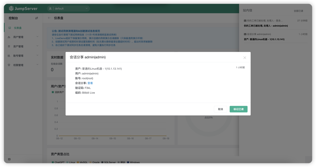在JumpServer v3.6.0版本中,当一个会话被分享到指定人时,被指定人的站内信将会收到一条分享会话的消息通知。