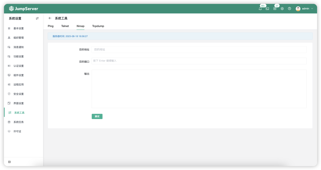 在JumpServer v3.6.0版本中,选择“系统设置”→“系统工具”,新增Nmap(端口扫描)和TCPDUMP(网络数据采集分析)工具,管理员可以在Web页面上进行简单的工具操作,便于排查堡垒机相关问题。