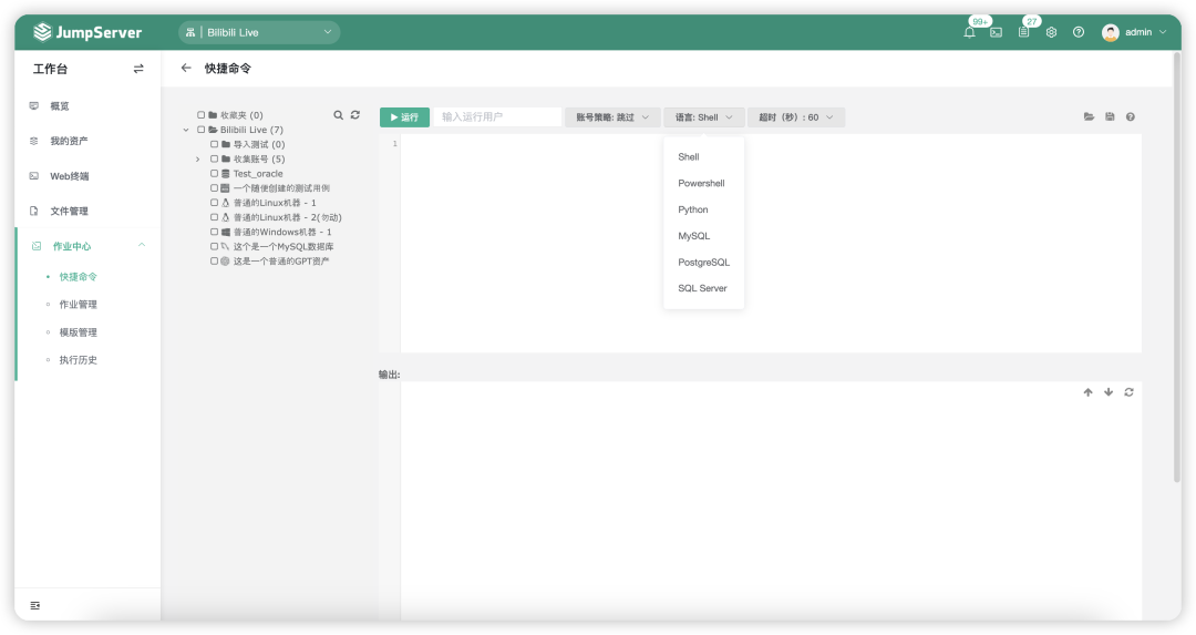 在JumpServer v3.6.0版本中,“作业中心”新增了执行的命令种类,可以对MySQL、PostgreSQL、SQL Server数据库进行批量命令操作,快速对多副本资产进行重复命令操作。