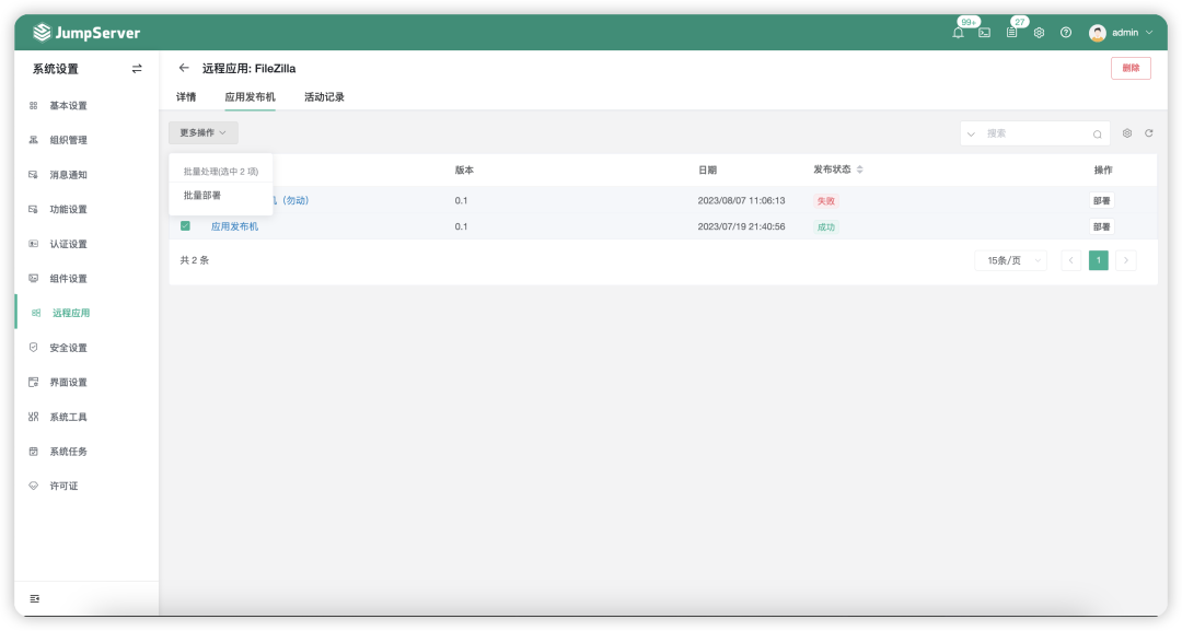在JumpServer v3.6.0版本中,支持将单个远程应用批量推送至纳管的远程发布机上。