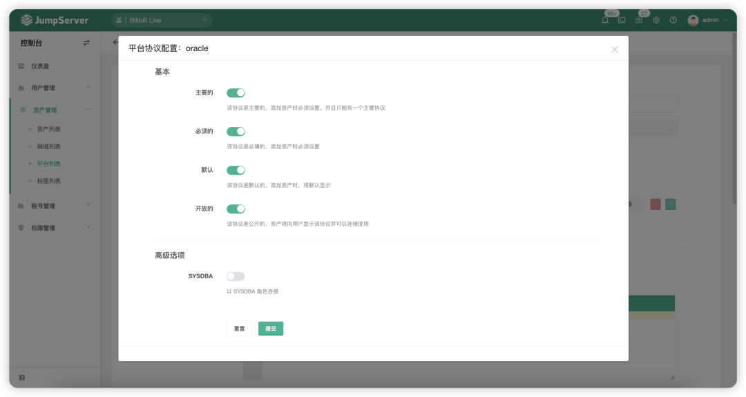 在JumpServer v3.6.0版本中,用户可以在“系统平台”→“Oracle”协议中,点击齿轮按钮设置此平台协议下的Oracle数据库在连接时使用“SYSDBA”角色进行连接。