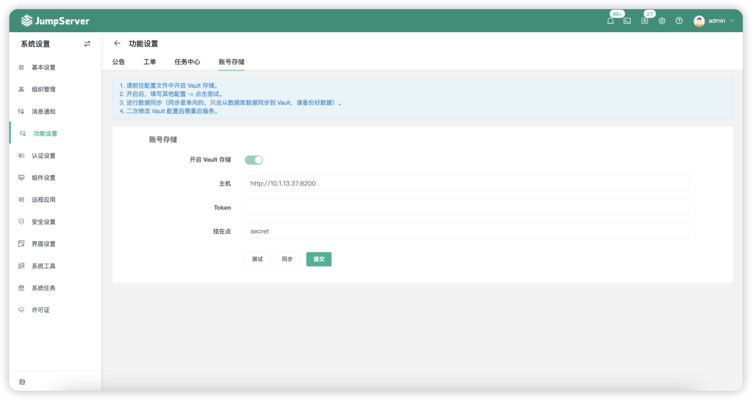 在JumpServer v3.6.0版本中,账号密钥支持第三方密钥存储系统。用户需要在“config.txt”配置文件中修改参数“VAULT_ENABLED”为“true”,然后回到页面进行配置即可。
