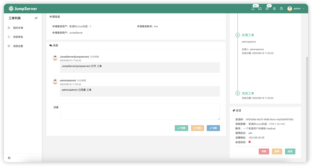 在JumpServer v3.6.0版本中,对于“登录复核”连接成功的资产所生成的会话,工单审批者可以在“工单详情”页面的右下角处对该连接会话进行控制(包括暂停、恢复、终断和监控操作)。