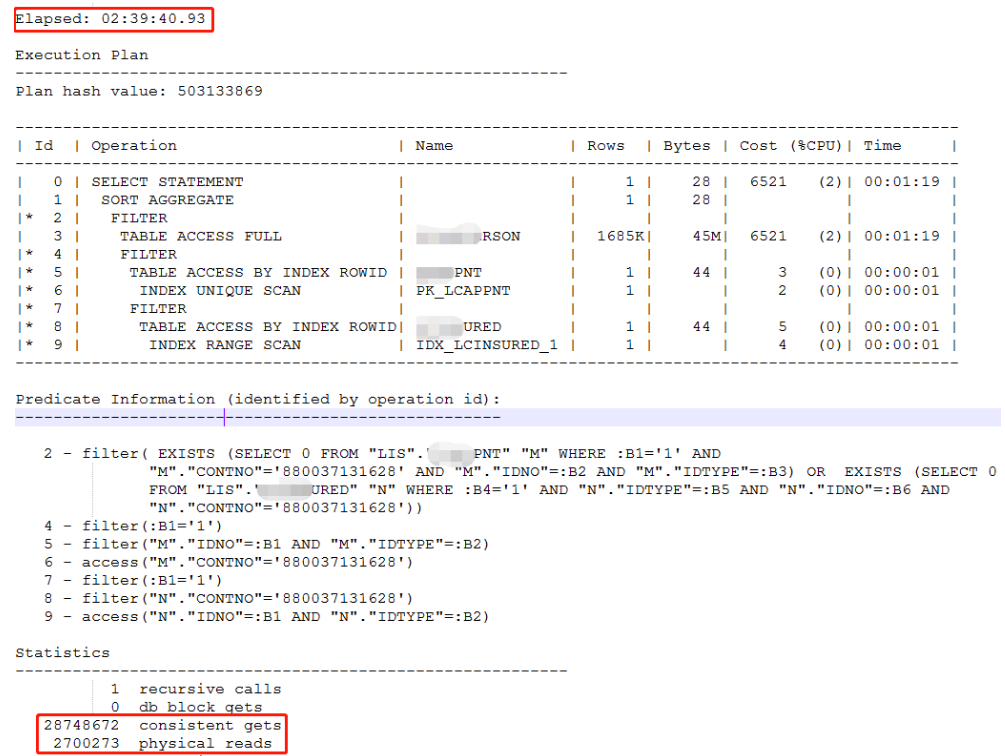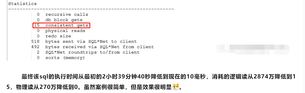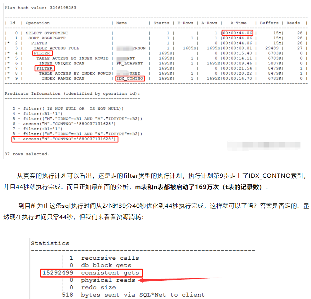 这些因为第一次sql执行有大量的物理读(270w次), 而第二次执行时, 这些数据块都已经读到了内存, 物理读(physical reads)是0. 所以, 实际上这一步的优化只是提升了不到1倍, 如果数据不在缓存,执行时间会远高于44秒. 这里也可以看出, 这个库的存储IO能力比较差,应该是传统的机械磁盘.